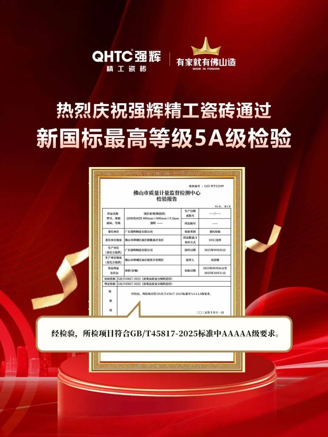 GB/T 45817-2025《消费品质量分级 陶瓷砖》(俗称“新国标”)即将于2025年12月1日正式实施。10月11日,强辉的“绒岩”系列产品已率先通过国家级检测机构的检测,达到了新国标中5A等级的要求。