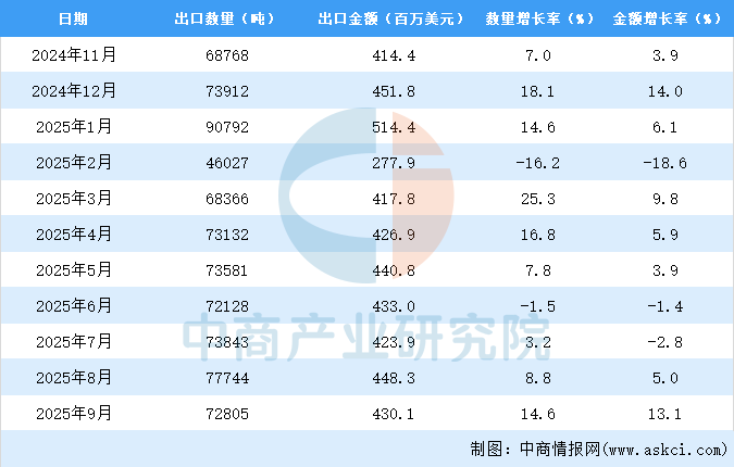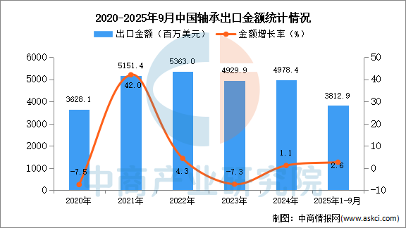 从金额方面来看,数据显示,2025年1-9月中国轴承出口金额3812.9百万美元,同比增长2.6%。