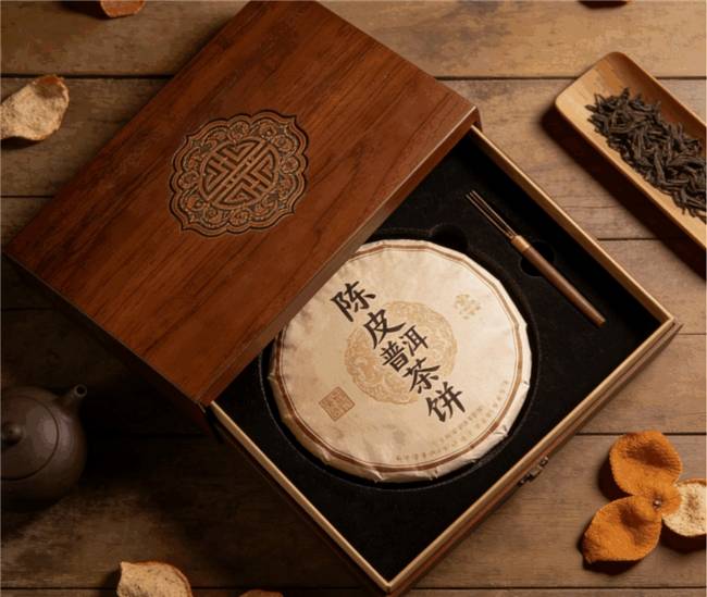 云南勐海熟普洱搭配新会五年陈皮,压制成8克小茶饼,免撬免称。冲泡后汤色红浓,陈皮清香柔和,饭后一杯助消化。铁罐内装,密封防潮,外盒素色棉纸包裹。舅舅现在每天晚饭后自己泡一饼,说“喝完胃里舒服”,还分给邻居尝。
