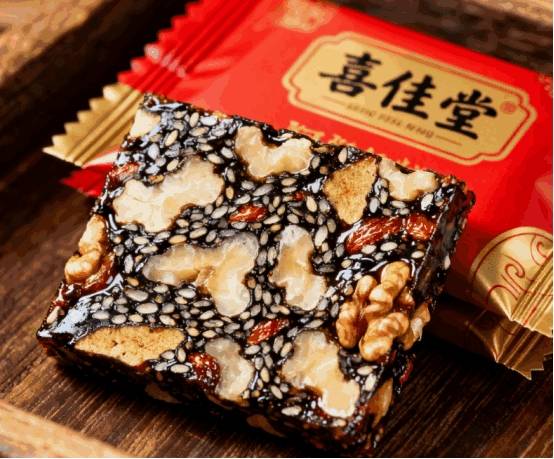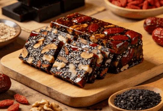 以山东东阿道地阿胶为基底,配黑芝麻、核桃仁、去核红枣与宁夏枸杞,古法慢火熬制12小时,全程未添加防腐剂、人工香精或明胶。成品质地柔韧软糯,甜味源于果仁与枣肉的自然渗出,咬下去先是微润,随后坚果香缓缓释放,吃完口中清爽,指尖不沾渣。