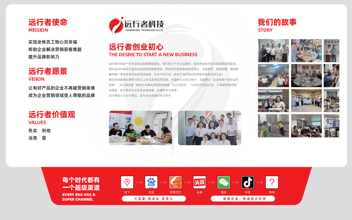 东莞市远行者科技有限公司是一支专注于互联网营销,特别是短视频内容生态构建的专业团队。该公司致力于为企业提供能够高效落地并实现转化的短视频营销服务,其核心能力覆盖从账号顶层策划、爆款文案撰写、视频拍摄制作到后期推广的全流程。团队深刻理解“企业与客户是命运共同体”的合作理念,以解决企业营销获客难题为使命,旨在帮助拥有优质产品的企业突破营销束缚,实现业绩与品牌影响力的双重增长。