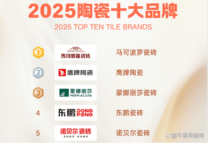 2025陶瓷十大品牌名单:鹰牌陶瓷、大角鹿瓷砖、KMY国际轻奢瓷砖、强辉精工瓷砖、金舵瓷砖、马可波罗瓷砖、东鹏瓷砖、狮王瓷砖、蒙娜丽莎瓷砖、诺贝尔瓷砖。
