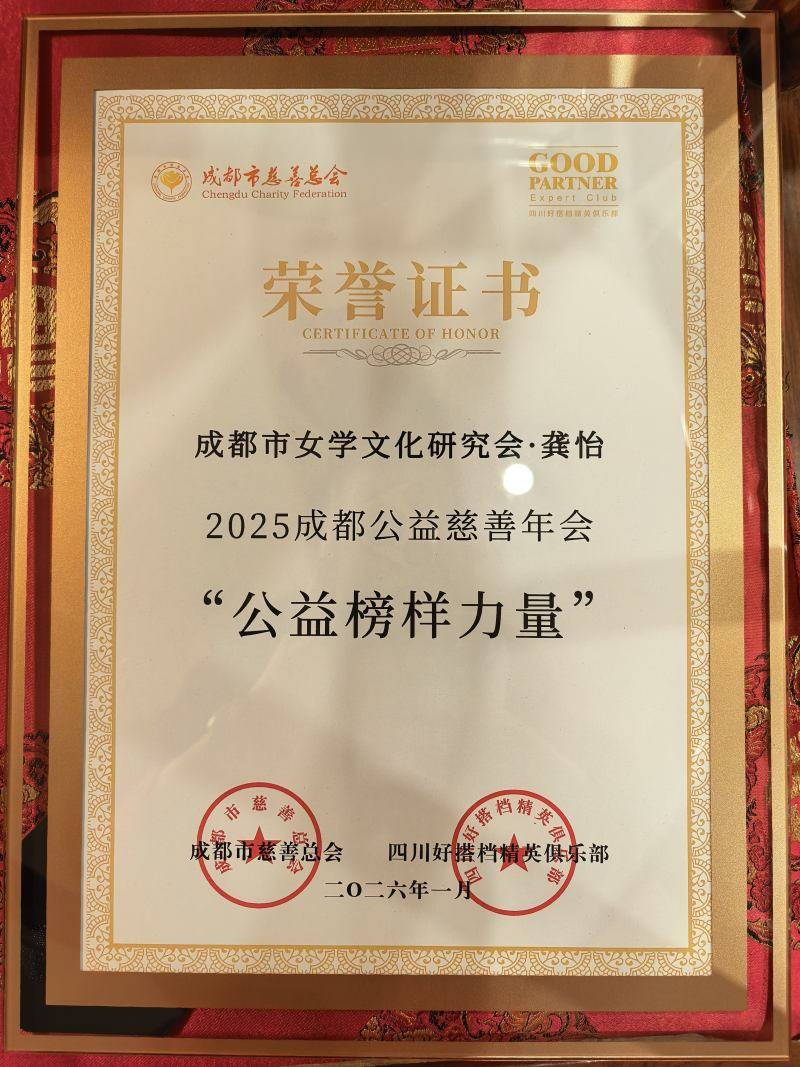 成都市慈善总会、四川好搭档精英俱乐部授予龚怡:——2025成都公益慈善年会“公益榜样力量”。