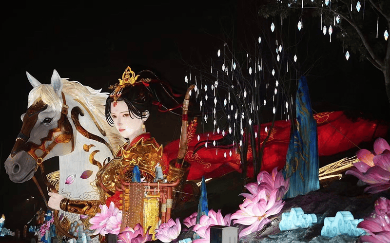 其次本届灯会更将彩灯、扎染、剪纸等非遗技艺与华夏神话史诗、经典历史故事深度绑定。围绕马年新春意象,众多民间故事、上古传说和民俗元素将在灯会中得以精彩呈现。除了叙事与主题的巧思,工艺层面的突破更让“木兰传奇”灯组焕发生机。创作团队实现两项关键突破:通过特殊材料与骨架设计,还原木兰发型与马鬃飘逸动态,攻克彩灯马毛发表现难点。此外,运用3D捕捉技术让木兰面部神态灵动,赋予其“生命感”,最终在美学、情感与技术维度均达到新高度。